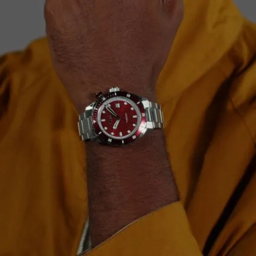 • Ziffernblatt: Auffälliges rotes Ziffernblatt mit klar ablesbaren Indizes und Datumsanzeige