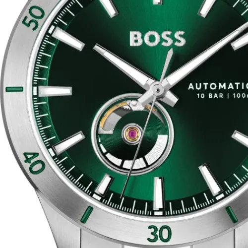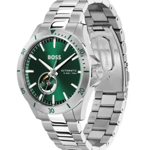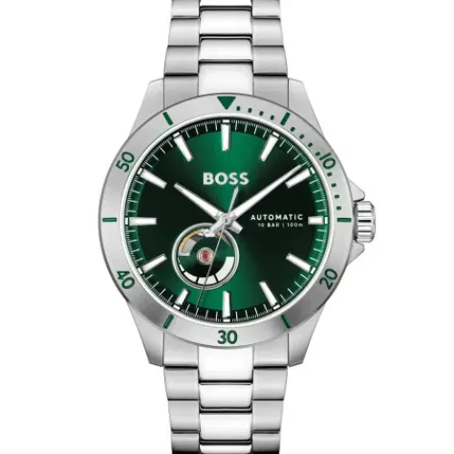 Die Boss Troper Automatic mit grünem Ziffernblatt vereint stilvolle Präzision und moderne Technik. Das ausdrucksstarke grüne Ziffernblatt wird von einem eleganten Edelstahlrahmen umgeben, der der Uhr sowohl Robustheit als auch …einen zeitlosen Look verleiht.