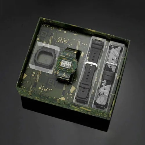 Das trendige …und gleichzeitig zeitlose Druckdesign der Uhr stellt die Original Platine dar, welche als elektronisches Bauteil in der 5600er Serie verwendet wird. Die G-SHOCK wird mit einer matt schwarzen Lünette sowie einem Armband aus Resin geliefert, auf dem dieModulnummer „3229“ verewigt ist. Ebenfalls im Set enthalten ist ein Stoffarmband mit einer lumineszierenden und reflektierenden Oberfläche, das mit einem Platinendesign in Schwarz und Weiß bedruckt ist.