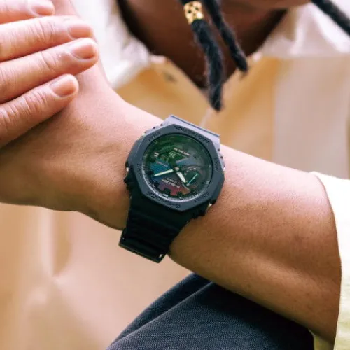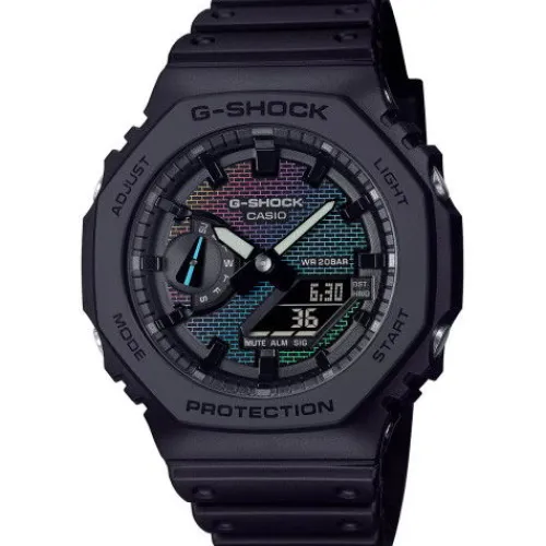 Bei den Modellen GA-2100 und GM-2100 wird das schimmernde Zifferblatt-Ziegelmuster durch eine Kombination aus Silberdampfbeschichtung, Lasergravur und Regenbogenfarben-Druck erzeugt.