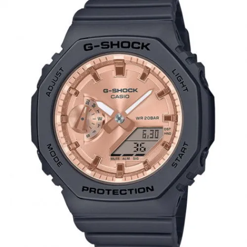 Die Uhren der GMA-S2100-Serie verfügen über ein durch Aufdampfen beschichtetes flaches Zifferblatt in Roségold, mit einfachen Strichmarkierungen für einen schlichten, minimalistischen …und dennoch glanzvollen Style.