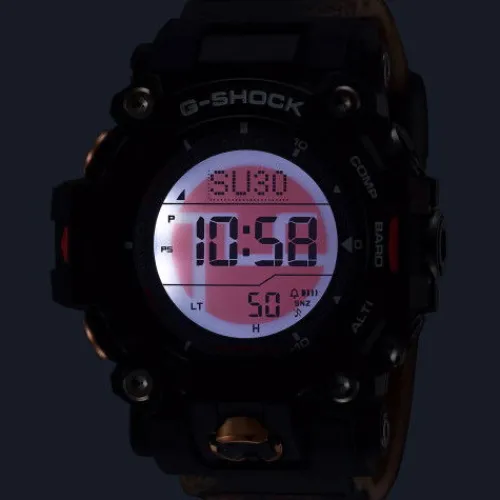 Das sandfarbige Band wurde entwickelt, um das Gefühl des Rennfahrens durch Wüstensandsand zu erfassen. Es ist mit einem schwarzen Spritzmuster bedruckt, das an die Spuren erinnert, die von Rennfahrern zurückgelassen werden. Die Komponenten der Edelstahllünette – die erste beim Modell GW-9500 – sind schwarz beschichtet, was für ein furchtloses Erscheinungsbild sorgt, das sowohl Stärke als auch praktischen Luxus ausstrahlt.