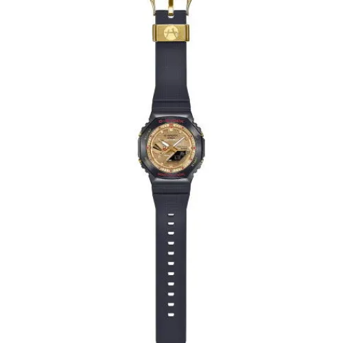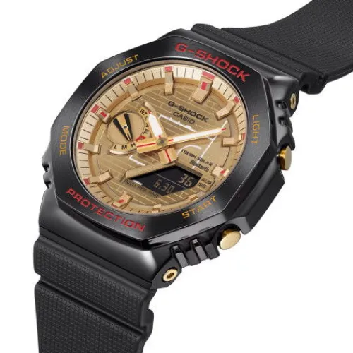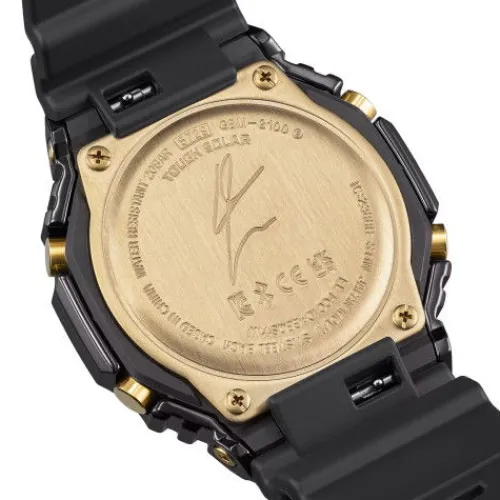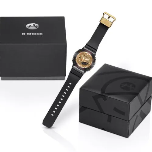 Dieses Kooperationsmodell …basiert auf der GBM-2100 und zeichnet sich durch eine markante Edelstahllünette, Solartechnologie und Bluetooth®-Konnektivität aus. Ein roter Akzent – eine G-SHOCK Markenfarbe, die auch Rui Hachimuras Leidenschaft für den Sport ausdrückt – hebt sich von dem goldenen Zifferblatt ab, das ein Basketballplatz-Motiv zeigt. Das schwarze Armband bildet einen schönen Kontrast zum Zifferblatt und strahlt Stärke aus.