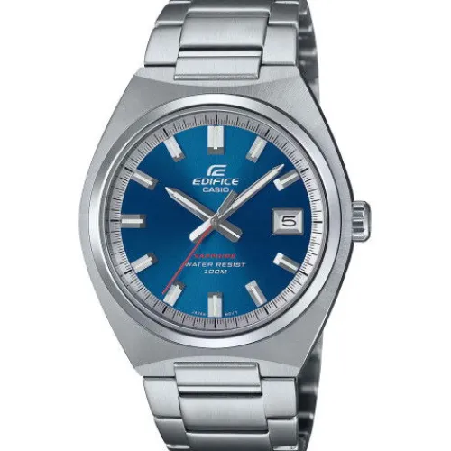 Die schmale, hochglanzpolierte Lünette und das runde Edelstahlgehäuse mit strahlenförmigem Haaransatz bilden eine perfekte Kombination …aus einem klassischen Look und solider Haptik. Das Zifferblatt der EFB-109D-1A glänzt in einem hellen Schwarz, mit einem roten Akzent auf dem Sekundenzeiger. Die EFB-109D-2A kommt mit einem blauen Zifferblatt und das EFB-109D-7A mit einem silbernen Zifferblatt, das jeweils von einem feinen Sonnenstrahl-Design geprägt ist, das vom Zentrum ausstrahlt.