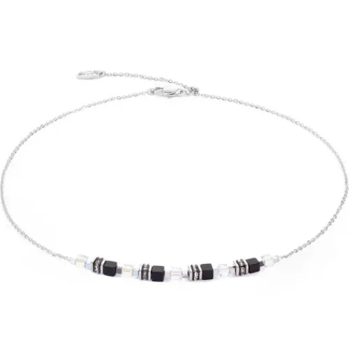The „Mini Cubes & Chain“ necklace in silver and black impresses with its simple elegance and sophisticated design. This piece of jewellery enchants with its delicate design and the unique charm of the materials. The necklace combines the timeless beauty of real stone cubes such as black onyx and …rock crystal with the dazzling lustre of Swarovski crystals. The innovative sliding clasp ensures a customised fit and allows you to adjust the length of the necklace as desired. This offers optimum wearing comfort and versatile styling options. Matching earrings and bracelet from the same collection round off your look perfectly. COEUR DE LION offers you the highest quality and a timeless design that sets elegant accents.