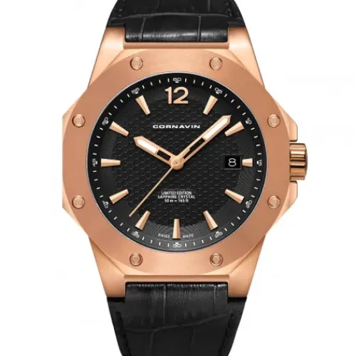 Die Cornavin CO 2021-2020 aus der Downtown 3-H-Kollektion ist leicht an ihrem schwarzen Zifferblatt mit Wabenstruktur zu erkennen. Die Super-LumiNova auf Stunden- und Minutenzeiger vereinfacht das Ablesen der Zeit. Ihre Cornavin wird durch Saphirglas geschützt und besteht ausschliesslich aus …Materialien von hervorragender Qualität. Das polierte, rosegold PVD-beschichtete Gehäuse dieser Cornavin hat einen Durchmesser von 41 mm und ist mit acht Schrauben auf der achteckigen Lünette verziert. Die Uhr ist mit einem komfortablen und eleganten schwarzen Lederband gepaart. Kombiniert mit einer hochwertigen Butterfly-Schliesse aus Edelstahl, sorgt dieses für besten Tragekomfort. Die Eleganz einer nahtlosen Kontinuität von Gehäuse zu Armband wird durch das spezielle Cornavin Befestigungs-Design gewährleistet.