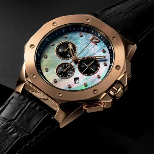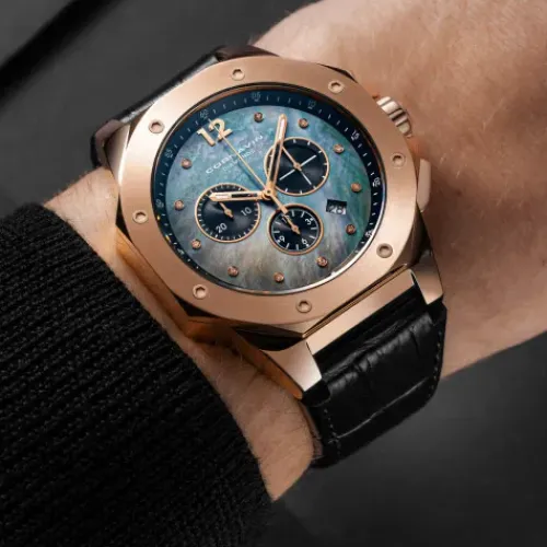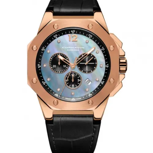 Das polierte, rosegold PVD-beschichtete Gehäuse dieser Cornavin hat einen Durchmesser von 44.5 mm und ist mit acht Schrauben auf der achteckigen Lünette verziert. Die seitlichen Drücker und die verschraubte Krone verleihen der Uhr ein luxuriöses Auftreten. Die Uhr ist mit einem komfortablen und eleganten schwarzen Kalbslederband gepaart. Kombiniert mit einer hochwertigen Schmetterlingsschließe aus Edelstahl sorgt dieses für besten Tragekomfort. Die Eleganz einer nahtlosen Kontinuität von Gehäuse zu Armband wird durch das spezielle Cornavin Befestigungs-Design gewährleistet.
