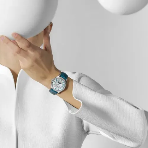 Der sehr klassische Charakter dieser Komposition wird noch durch einen neuen Stundenring verstärkt, bei dem die traditionellen arabischen Ziffern schlanken und graziösen römischen weichen. Erstmals in der Kollektion wird ihre Farbe auf dem Armband aus Steppleder mit Faltschliesse wieder aufgenommen. Die Idee, Indizes und Armband aufeinander abzustimmen, ist eine ästhetische Eigenheit, die allein dieser Kollektion vorbehalten und damit ein seltenes Statement in der Uhrmacherei ist.