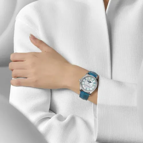 Die Classics Elegance Luna ist eine neue Kreation innerhalb der Classics-Kollektion von Frederique Constant. Eine grosse Premiere für das Haus: Die Mondphase der Uhr wurde von der Tochter des Forschungs- und Entwicklungsleiters der Manufaktur entworfen. Eine verschmitzte und verliebte Mondphase …mit zwei Halbmonden, die sich umarmen, zeigt sich auf einem Zifferblatt aus Perlmutt in einem Stahlgehäuse mit 36 mm Durchmesser.