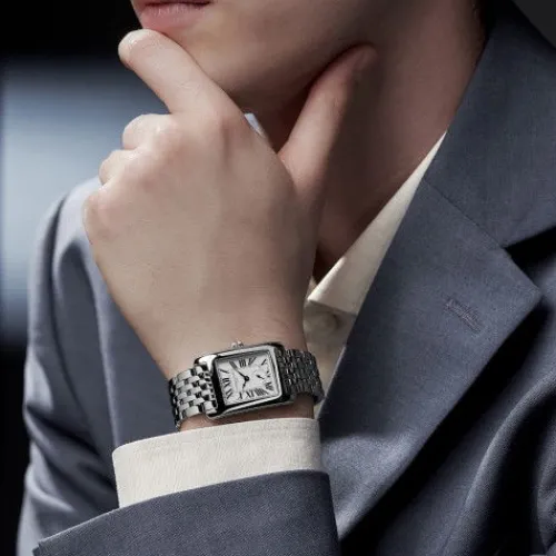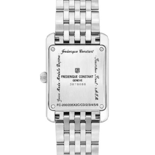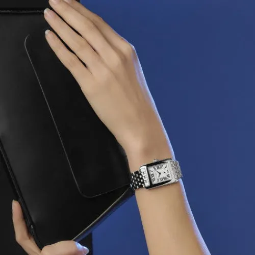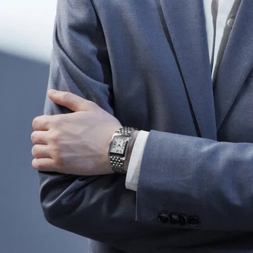 Das rechteckige Gehäuse umschliesst ein ebenfalls rechteckiges Zifferblatt mit Minuterie, wo auf 6 Uhr ein kleiner, unabhängiger Sekundenzeiger sichtbar wird. Dieser hebt sich durch eine leichte Hohlfläche vom Zifferblatt ab. Rund herum erscheinen die Stunden in grossen römischen Ziffern entlang einer sogenannten Sector-Dial-oder Eisenbahn-Minuterie, die so typisch für die Belle Époque ist. Dasselbe gilt für die Zwiebelkrone, eine Reminiszenz an die alten Taschenuhren, die damals allmählich von den Armbanduhren verdrängt wurden.