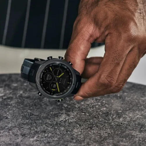 • Edles Design: Robustes Titangehäuse in Carbon-Optik, kombiniert mit einem leichten und widerstandsfähigen Silikonarmband.