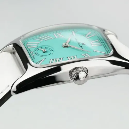 Mit ihrer kunstvoll gewölbten Gehäuseform und dem charakteristischen Art-Déco-Design präsentiert sich die Hamilton Boulton M in neuen, auffälligen Farben, die von den klassischen Macaron-Sorten inspiriert sind. Das wunderschöne mintgrüne Zifferblatt des Zeitmessers ist mit römischen …Ziffern in Weiss verziert und wird mit einem farblich passenden Lederarmband abgerundet. Mit ihren köstlichen Farbkombinationen wird die Hamilton Boulton zu einem zuckersüssen Genuss am Handgelenk. Der Zeitmesser lässt alte und neue Designelemente nahtlos miteinander verschmelzen und verströmt ein feminines Flair voll zeitloser Frische.