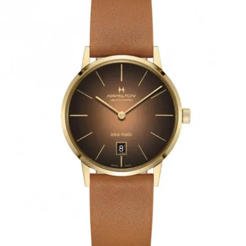 Die warmen Akzente und rauchfarbenen Elemente der neuen Hamilton Intra-Matic erzeugen einen maskulinen American Classic Style im Vintage-Look. Inspiriert von der langen, ereignisreichen Geschichte Hamiltons, kombiniert die Intra-Matic moderne Nuancen mit echten Vintage-Details aus Hamiltons …American Classic Kollektion.