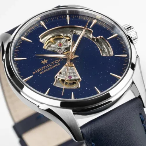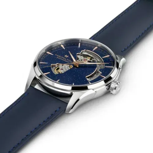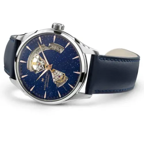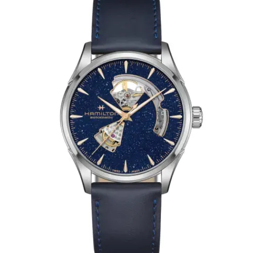 Die Jazzmaster Open Heart gewährt einen Blick in die leistungsstarke Mechanik in ihrem Inneren und überlässt auf ihrem neuen 42-mm-Zifferblatt der Präzision die Bühne. Dieser atemberaubende Zeitmesser mit einem faszinierend funkelnden Zifferblatt in Mitternachtsblau lässt die Moderne der …städtischen Architektur mit der Unendlichkeit des Kosmos verschmelzen. Das Zifferblatt, das die sich kontinuierlich weiterentwickelnde Handwerkskunst und die Liebe zum Detail von Hamilton zeigt, stellt das Automatikwerk H-10 ins Rampenlicht. Die Jazzmaster Open Heart Auto verfügt über eine Gangreserve von 80 Stunden und eine Spiralfeder aus Nivachron™ und wird von einem eleganten blauen Lederarmband am Handgelenk gehalten. Entdecken Sie unsere Kollektion an Dresswatches.