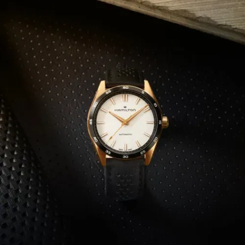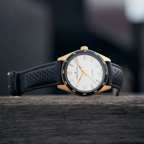Die Jazzmaster Performer Serie überzeugt durch ihre ausdrucksstarke sportliche Optik und ist wie geschaffen für alle, die weder auf Funktion noch auf Stil verzichten möchten. Diese Jazzmaster Performer Automatic wird vom Automatikwerk H-10 mit 80 Stunden Gangreserve angetrieben. Sie besitzt ein …38-mm-Edelstahlgehäuse mit PVD-Beschichtung in Roségold, das durch ein schlicht gehaltenes weisses Zifferblatt und ein auf die Lünette abgestimmtes schwarzes perforiertes Lederarmband im Rennsportstil abgerundet wird.