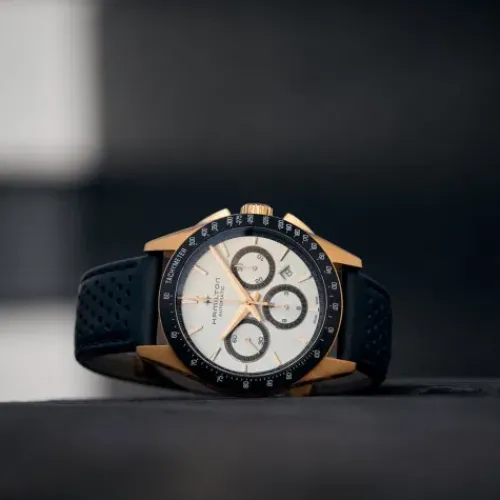 Die Jazzmaster Performer Serie überzeugt durch ihre ausdrucksstarke sportliche Optik und ist wie geschaffen für alle, die weder auf Funktion noch auf Stil verzichten möchten. Diese Jazzmaster Performer Automatic Chronograph wird vom automatischen Chronographenwerk H-31 mit 60 Stunden …Gangreserve angetrieben. Sie besitzt ein 42-mm-Edelstahlgehäuse mit PVD-Beschichtung in Roségold, das durch ein elegantes weisses Zifferblatt und ein auf die Lünette abgestimmtes schwarzes perforiertes Lederarmband im Rennsportstil abgerundet wird.