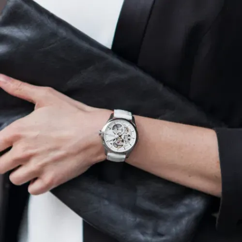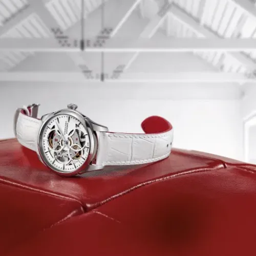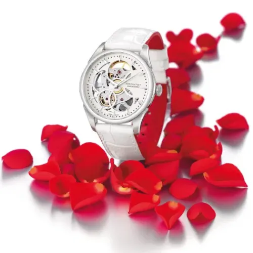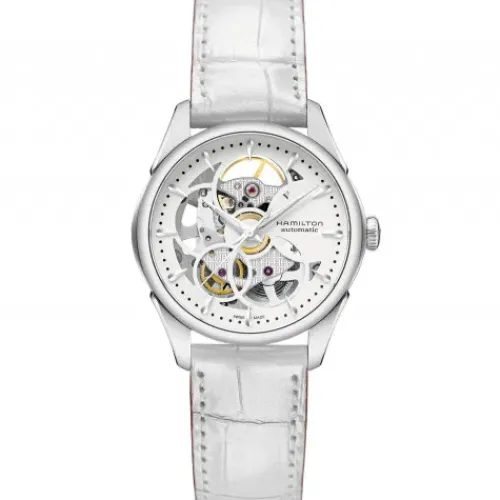 Die Jazzmaster Viewmatic Skeleton Lady zeigt Hemmung, Feder und Federhaus des H-10-S Kalibers, wie sie nahtlos und beständig zusammenarbeiten und die Zeit im Takt halten. Das skelettierte Zifferblatt verbirgt wenig und überlässt nichts der Vorstellungskraft, denn Hamilton zieht alle Register, …um unser Know-how unter Beweis zu stellen.