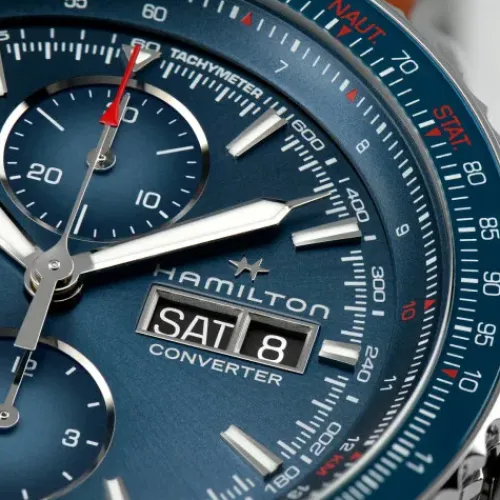 Mit unserer Khaki Aviation Converter Auto Chrono wird die Navigation in luftiger Höhe zum Kinderspiel: Mit ihrer beidseitig drehbaren «Rechenschieber»-Lünette können wichtige Umrechnungen und Metriken im Handumdrehen berechnet werden. Das Uhrwerk H-21-Si mit einer Spiralfeder aus Silizium …sorgt für optimierte Leistung und Präzision. Zugleich präsentiert sich die Fliegeruhr als perfekte Kombination aus Funktionalität und Fliegerästhetik: Ihr 44-mm-Edelstahlgehäuse wird durch ein braunes Lederarmband und ein blaues, an einen wolkenlosen Himmel erinnerndes Zifferblatt abgerundet.