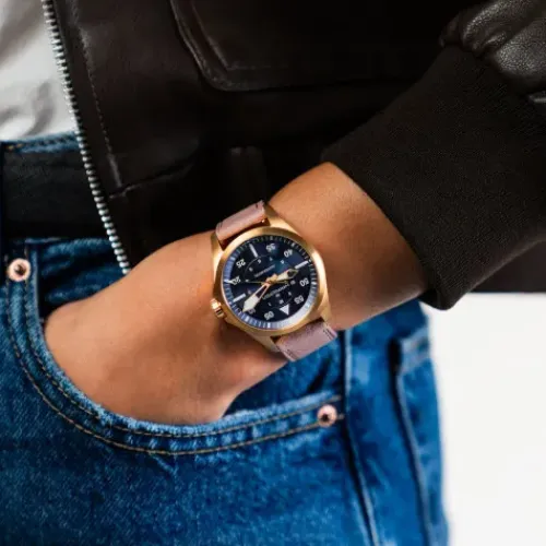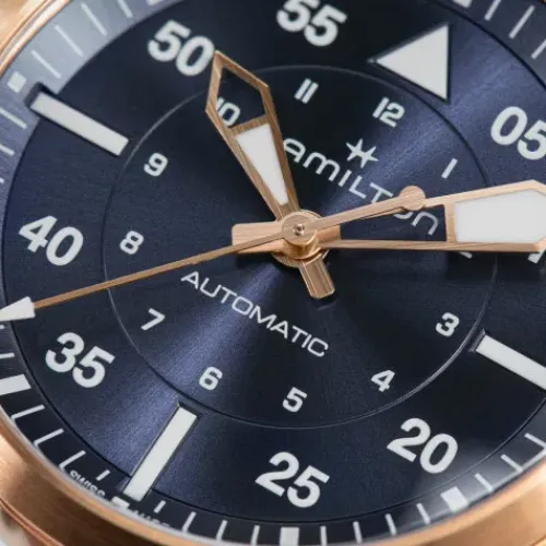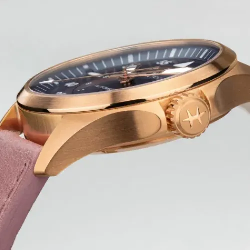 Die Khaki Pilot Auto präsentiert sich mit dem erkundungsfreudigen, abenteuerlustigen Spirit der Khaki und wurde speziell für all diejenigen kreiert, deren Herz für das Fliegen schlägt. Diese 36-mm-Versionen verschreiben sich dem Trend kleinformatiger Armbanduhren und werden vom Automatikwerk …H-10 mit einer Gangreserve von 80 Stunden und einer Spiralfeder aus Nivachron™ angetrieben. Ausgestattet mit den für das Cockpit erforderlichen Präzisionsstandards ist sie mit ihrem kompakten Design nicht nur in der Luft, sondern auch auf festem Boden der ideale Begleiter. Die Khaki Pilot Auto präsentiert sich mit einem rosafarbenen Lederarmband und einem Zifferblatt in Mitternachtsblau mit spezieller Super-LumiNova-Beschichtung für bessere Ablesbarkeit, das von einem eleganten roségoldfarbenen Edelstahlgehäuse mit PVD-Beschichtung umschlossen wird.