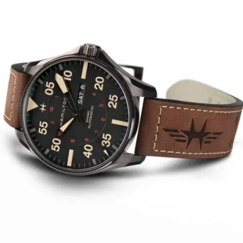Diese 46 mm Uhr ist perfekt für einen Piloten oder einen urbanen Flieger. Mit praktischer Tagesdatumsfunktion, gut lesbaren SuperLumiNova® Zeigern und Indizes und dem exklusiven Automatikwerk H-30 mit bis zu 80 Stunden Gangreserve. Der Himmel ist die Grenze für diese unverwechselbare Hamilton …Luftfahrtuhr.