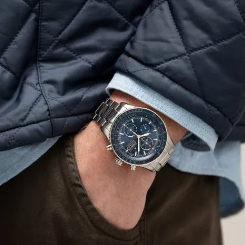 Mit unserer Khaki Aviation Converter Auto Chrono wird die Navigation in luftiger Höhe zum Kinderspiel: Mit ihrer beidseitig drehbaren «Rechenschieber»-Lünette können wichtige Umrechnungen und Metriken im Handumdrehen berechnet werden. Das Uhrwerk H-21-Si mit einer Spiralfeder aus Silizium …sorgt für optimierte Leistung und Präzision. Zugleich präsentiert sich die Fliegeruhr als perfekte Kombination aus Funktionalität und Fliegerästhetik: Ihr 44-mm-Edelstahlgehäuse wird durch ein Edelstahlarmband und ein blaues, an einen wolkenlosen Himmel erinnerndes Zifferblatt abgerundet.