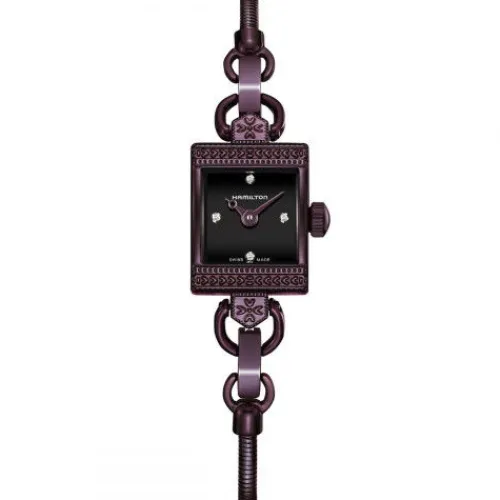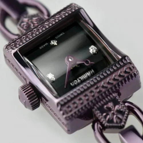 Die Lady Hamilton Vintage Quartz, die den Charme der 1950er und zeitgenössischen Esprit gekonnt zusammenführt, tauscht ihre traditionellen Metalltöne gegen ein warmes Schwarz und ein dunkles pflaumenblaues Armband bzw. Gehäuse ein. In Verbindung mit einem beeindruckenden gebürsteten schwarzen …Zifferblatt mit Sonnenschliff mit vier funkelnden Diamanten strahlt diese einzigartige Uhr mit ihrer Trägerin um die Wette.