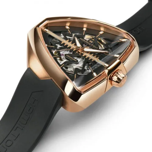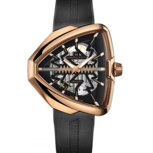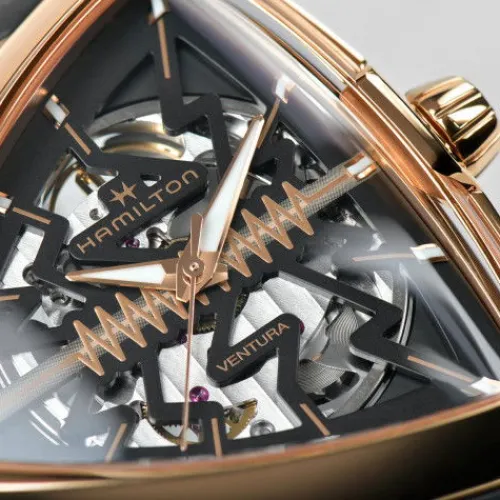 Setzen Sie ein Statement mit der hochmodernen Ventura Elvis80 Skeleton, eine Hommage an die Vergangenheit, Gegenwart und Zukunft der ersten elektrischen Uhr der Welt. Als ausdrucksstarke Weiterentwicklung eines bahnbrechenden Zeitmessers verfügt sie auf ihrem präzise skelettierten Zifferblatt, …das von einem dreieckigen Gehäuse mit leuchtend roségoldfarbener PVD-Beschichtung eingerahmt wird, über ein markantes Zickzackmuster. Dieses energiegeladene Motiv würdigt ein Symbol der Innovation und zieht den Blick auf das H-10-S – Uhrwerk mit Automatikaufzug, das sich darunter befindet.