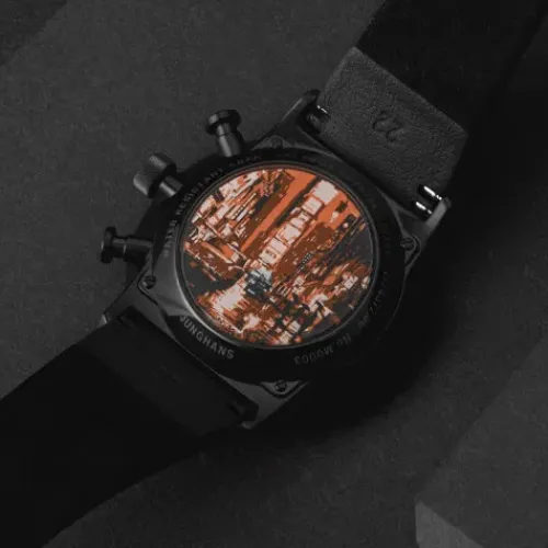 Klare Formen und eine ausdrucksstarke Farbgebung sind die Merkmale der FORM A Chronoscope. Das Zusammenspiel von matten und polierten Flächen in tiefem Schwarz erzeugen eine spannungsvolle Dynamik. Die Akzente in Gelb, Grau oder Orange sind von einem Kunstwerk des britischen Künstlers Richard …Macneil inspiriert, das sich als farblich adaptierter Glashinterdruck auf dem Gehäuseboden wiederfindet. Der mechanische Chronograph ist mit einem flachem Saphirglas ausgestattet und bis 5 bar wasserdicht.