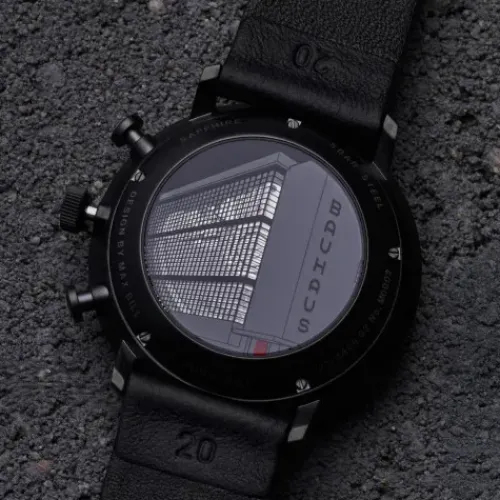 Minimalistisches Design mit roten Akzenten: Die Bauhaus-Modelle der Linie max bill greifen die roten Türen des Bauhaus-Gebäudes auf – ein Detail, das Max Bill bei seinem ersten Besuch in Dessau sofort ins Auge fiel. Durch die Fenster eines Bauhaus-Abbilds auf dem Gehäuseboden kann man sehen, …wie das mechanische Werk im Inneren arbeitet.