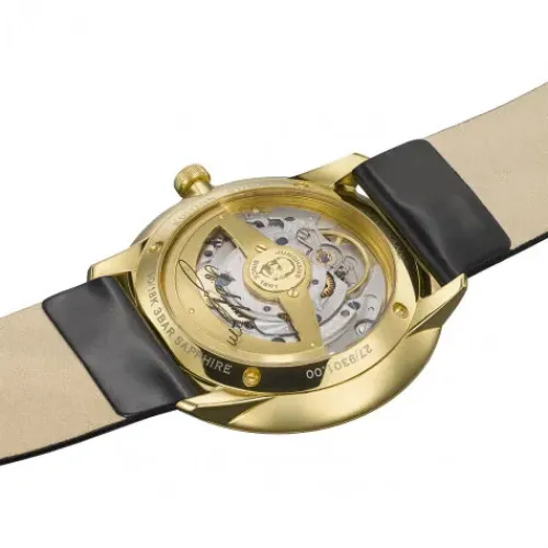 Eine Hommage an Erhard Junghans ist natürlich auch eine Hommage an klassisches Uhrendesign. Angefangen beim historischen Junghans Schriftzug, bis hin zu den feinen römischen Zahlen des Zifferblatts. Wie langgezogene Indexe wirkend, sind sie subtil auf die Geometrie der Meister Linie abgestimmt. …Auch die Rückseite steht gänzlich im Zeichen des Gründers: Der gewölbte Saphirglasboden trägt eine Signatur, der zweischenklige Rotor ein eingraviertes Profil von Erhard Junghans – eine schöne Erinnerung daran, dass dessen Geist auch heute noch Antrieb des Unternehmens ist. Dieses Modell ist limitiert auf 200 Uhren.