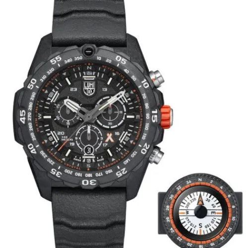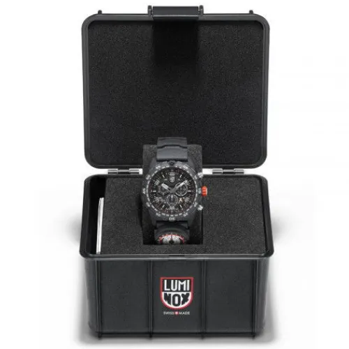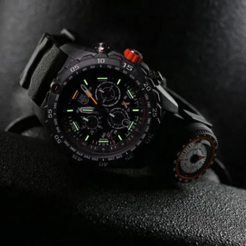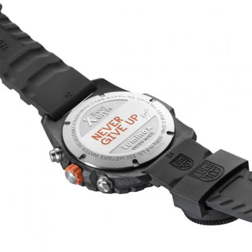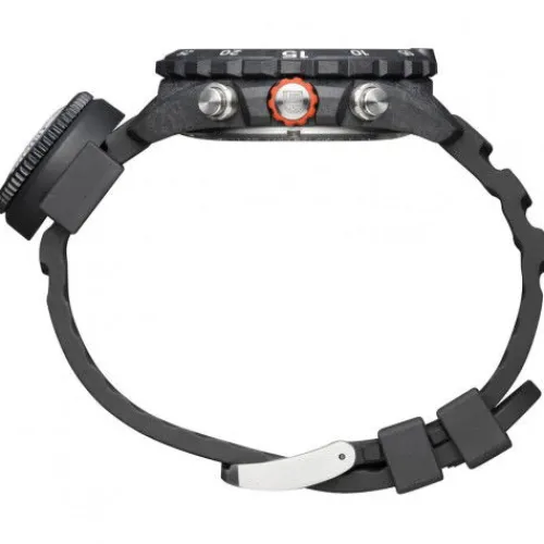 Die MASTER-Serie umfasst zwei Chronographen mit 45 mm CARBONOX+™-Gehäusen mit orangefarbenen Details auf dem Gehäuse, einschließlich SOS im Morsealphabet zum schnellen Auffinden. Die Drucktasten des Chronographen sind aus massivem Edelstahl und die Edelstahlkrone verfügt über einen …orangefarbenen Gummiring für einen guten Grip. Diese aussergewöhnliche Uhr ist bis zu 300 Meter wasserdicht und verfügt über ein Saphirglas mit Antireflexbeschichtung. Sie wird mit einem schwarzen Armband aus Gummi geliefert und ist mit einem bereits am Armband angebrachten Kompass ausgestattet.