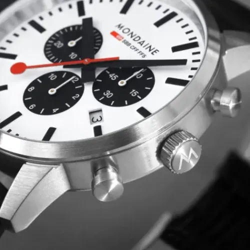 Dieser raffinierte, maskuline Chronograph verbindet das klassische Panda-Zifferblatt, ein weißes Zifferblatt mit schwarzen Hilfszifferblättern, mit dem ikonischen Bahnhofsdesign der Schweizerischen Bundesbahnen nahtlos und schafft eine …unwiderstehliche Fusion zweier Uhrenklassiker. Wie bei den originalen Panda-Zifferblättern befinden sich die Hilfszifferblätter auf der 3-, 6- und 9-Uhr-Position und einnern an die Markierungen eines Panda-Gesichts. Der Chronograph verfügt über ein 41 mm Gehäuse aus brossiertem Edelstahl, das eine neue, für diese Linie einzigartige Form einführt, und ist mit einer Datumsanzeige und einer Chronographenfunktion ausgestattet, die es dem Träger ermöglicht, das Datum zu verfolgen und die verstrichene Zeit präzise zu messen. Das Zifferblatt wird durch ein starkes und kratzfestes Saphirglas mit Antireflexionsbeschichtung geschützt und ist mit einem schwarzen veganen Traubenlederarmband kombiniert. Setze ein Statement mit diesem klassischen Zeitmesser!
