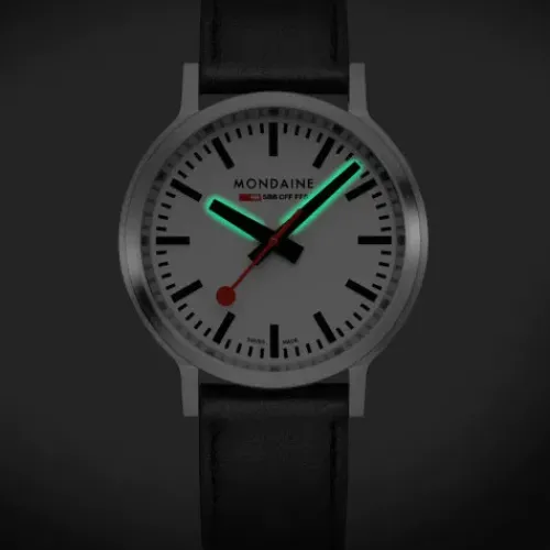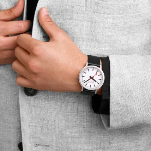 Die stop2go Uhr ist eine Hommage an die ikonische Bahnhofsuhr der Schweizerischen Bundesbahnen. Das auffallend robuste Design zeichnet sich durch ein Gehäuse ohne Krone und einen maskulinen Look aus. Das klassische, weiße Zifferblatt und das 41mm Gehäuse aus brossiertem Edelstahl werden mit …einem schwarzen, veganen Traubenlederarmband kombiniert. Ausgestattet mit dem exklusiven und einzigartigen Swiss Made stop2go Uhrwerk, das dem der Schweizerischen Bundesbahnen nachempfunden ist, verfügt sie über einen 2-Sekunden-Stopp. Die Uhr ist außerdem mit der patentierten BackLight-Technologie, die die Unterseite der Zeiger leuchten lässt und das Ablesen der Uhrzeit im Dunkeln ermöglicht, ausgestattet. Die Uhr wird mit einem Zeiteinstellstift geliefert, mit dem sich die Zeit leicht einstellen und die Zeiger ausrichten lassen.