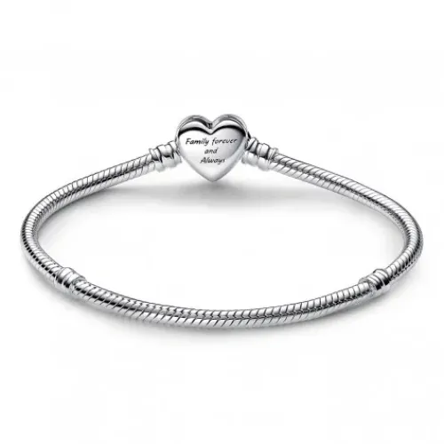 Das Pandora Moments Schlangen-Gliederarmband mit Funklendem Unendlichkeits-Herzverschluss symbolisiert die immerwährende Liebe zwischen Familienmitgliedern. Ein bedeutungsvolles Geschenk für die Menschen, die dir am nächsten stehen. Der Rand des offen gearbeiteten Herzverschlusses ist mit …Steinen besetzt und mit einem asymmetrischen Unendlichkeitssymbol verziert, das sich um das Herz rankt. Die Rückseite des Verschlusses ist mit der eingravierten Botschaft „Family forever and Always“ verziert. Das Armband verfügt über zwei Gewinde (zwei erhabene Zwischenelemente), die es in drei Abschnitte unterteilen. Style es mit bis zu 16-18 deiner Lieblingscharms oder deiner allerliebsten Charm-Anhängern, die deine Liebsten symbolisieren, oder schenke es jemandem, der dir am Herzen liegt.