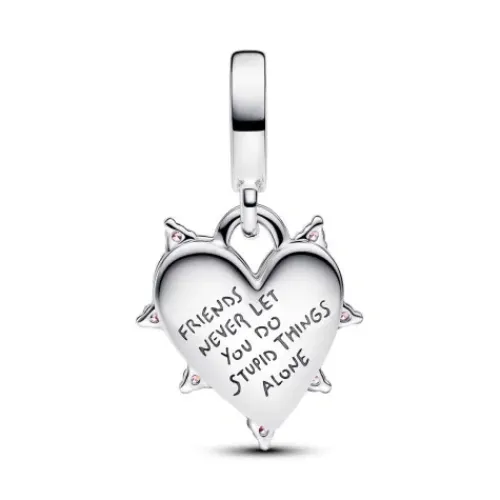 Feiere deine langjährigen Freundschaften mit unserem doppelten Charm-Anhänger aus Sterling-Silber mit funkelnden Steinen und einem rosafarbenen, im Labor hergestellten Opal. Auf der Rückseite des Charms ist die Botschaft „FRIENDS NEVER LET YOU DO STUPID THINGS ALONE“ eingraviert, eine …perfekte Hommage an die Menschen, die dir bei jedem Schritt zur Seite stehen.