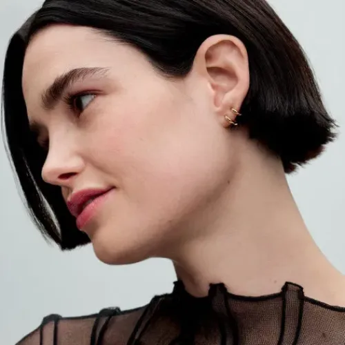 Die Doppelten Huggie-Kreolen-Ohrringe sorgen für doppelte Wirkung mit nur einem einzigen Ohrring. Jeder vergoldete Ohrring besteht aus einem Innenring und einem etwas kleineren äußeren Cuff, die mit einem Stift miteinander verbunden sind. Der innere Ring ist mit einem Klickverschluss versehen, …der äußere Ohrring ist geöffnet. Der innere Ring sollte näher am Gesicht positioniert werden, der Verbindungsstift liegt dabei hinter dem Ohrläppchen. Das Design des rechten und linken Ohrrings ist gespiegelt. Hol dir den doppelten Huggie-Effekt mit nur einem stilvollen Set.