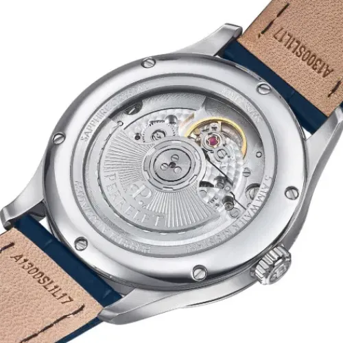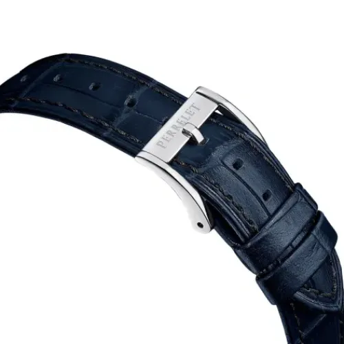 Diese Uhr hat einen Durchmesser von 39 mm und eine Gehäusehöhe von nur 9,56 mm und passt sich somit auch den kleinsten Handgelenken perfekt an. Ausgestattet mit einem nachtblauen Kalbslederarmband mit Krokodilprägung und einer mit dem Perrelet-Logo signierten Schließe ist diese Uhr ein perfektes und ausgewogenes Ensemble, dass zu jeder Zeit getragen werden kann. Sicherlich werden Sie der Versuchung nicht widerstehen können, diese raffinierte und gepflegte Ästhetik zur Schau zu stellen.