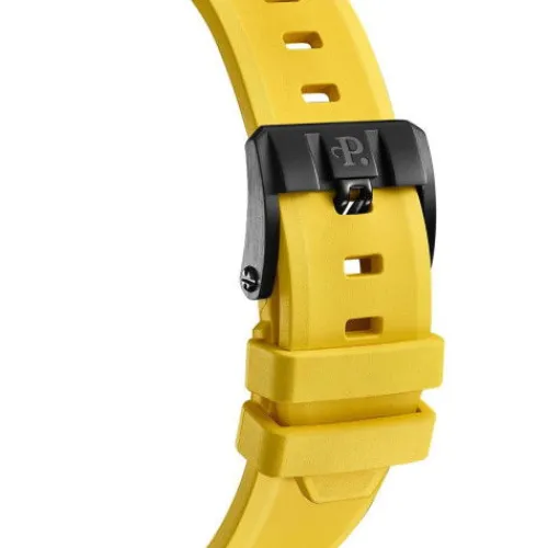 Der Perrelet Turbine Titanium 41 Yellow ist ein mutiges und stilvolles Statement-Stück, das sicher Blicke auf sich ziehen wird. Die Uhr ist aus leichtem und strapazierfähigem Titan mit einer schwarzen DLC-Beschichtung gefertigt, die kratzfest ist und im Laufe der Zeit nicht verblasst. Das ikonische Turbinen-Zifferblatt verfügt über ein leuchtend gelbes Zifferblatt, das zum Leben erwacht, wenn die Turbine rotiert. Das Armband aus Kautschuk ist ebenfalls gelb, was ein harmonisches und auffälliges Aussehen schafft.