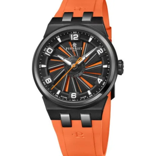 Der Perrelet Turbine Titanium 41 Orange ist ein mutiges und stilvolles Statement-Stück, das sicher Blicke auf sich ziehen wird. Die Uhr ist aus leichtem und strapazierfähigem Titan mit einer schwarzen DLC-Beschichtung gefertigt, die kratzfest ist und im Laufe der Zeit nicht verblasst. Das ikonische Turbinen-Zifferblatt verfügt über ein leuchtend orangefarbenes Zifferblatt, das zum Leben erwacht, wenn die Turbine rotiert. Das Armband aus Kautschuk ist ebenfalls orange, was ein harmonisches und auffälliges Aussehen schafft.
