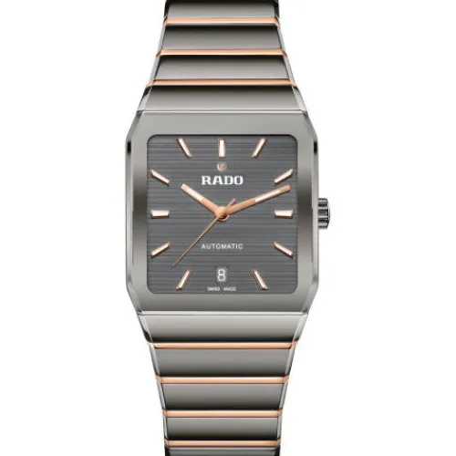 Seit ihrem Debüt im Jahr 1983 ist die Rado Anatom ein Symbol für bahnbrechendes Design und ultimativen Tragekomfort. Ihr charakteristisches Merkmal ist das zylindrische, metallisierte Saphirglas mit facettierten Kanten auf beiden Seiten, das nahtlos in ein Armband aus Plasma Hightech-Keramik …übergeht und so eine glatte, durchgehende Form schafft, die Gehäuse und Armband zu einer geschlossenen Einheit verschmelzen lässt. Das aus polierter Plasma Hightech-Keramik und Mittelgliedern aus poliertem roségoldfarbenen PVD-Edelstahl gefertigte Armband wird durch eine Dreifachschliesse aus gebürstetem Edelstahl sorgfältig gesichert. Unter dem markanten Glas liegt ein grau lackiertes Zifferblatt, das ein attraktives Muster aus horizontalen Linien aufweist. Die mit weissem Super-LumiNova® versehenen roségoldfarbenen Zeiger und Indizes bilden einen raffinierten Kontrast, der dem Zifferblatt zusätzlich Tiefe verleiht. Gekrönt wird das Zifferblatt mit dem ikonischen beweglichen Anker bei 12 Uhr, ergänzt durch ein diskretes Datumsfenster bei 6 Uhr. Herzstück der Uhr ist das Automatikwerk Kaliber R766 mit 21 Steinen, das durch den Gehäuseboden aus Saphirglas zu sehen ist. Das in fünf Lagen fein justierte Uhrwerk ist mit einer Nivachron™ Spiralfeder ausgestattet und bietet eine hohe Ganggenauigkeit sowie eine robuste Gangreserve von 72 Stunden. Dies unterstreicht den hohen Stellenwert, den Rado der Perfektion beimisst.