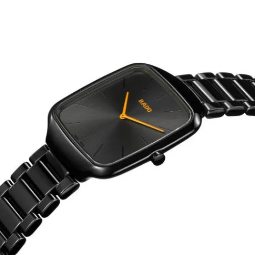 Erleben Sie mit der Rado True Square Thinline das harmonische Zusammenspiel von künstlerischem Ausdruck und Schweizer Präzision. Angetrieben von einem zuverlässigen Rado Quarzwerk vom Kaliber R420 gewährleistet diese Uhr mit müheloser Eleganz eine präzise Zeitmessung. Das 37 mm grosse …Gehäuse schafft das perfekte Gleichgewicht zwischen Stil und Tragbarkeit – damit ist das Modell für jeden Anlass geeignet. Das Gehäuse und die Krone aus polierter schwarzer Hightech-Keramik haben eine kühne und zeitgemässe Ästhetik und verkörpern die Essenz modernen Designs. Mit ihrer Monobloc-Konstruktion und dem flachen Saphirglas strahlt diese Uhr Langlebigkeit und zeitlose Eleganz aus. Das schwarze Ton-in-Ton-Zifferblatt mit Sonnenschliff ist mit im Farbton Sun Orange lackierten Zeigern ausgestattet und mit dem Rado Logo versehen, ebenfalls in Sun Orange. Perfekt komplementiert wird das Gehäuse durch ein mit Präzision gefertigtes Armband aus polierter schwarzer Hightech-Keramik – für einen nahtlos einheitlichen Look.