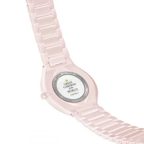 Die True Thinline x Great Gardens of the World Chapter 4 (Frühling) ist der Vorbote des Frühlings. Mit einem 39 mm grossen Gehäuse aus polierter roséfarbener Hightech-Keramik und einem herrlichen facettierten Saphirglas mit Blütenschliff erinnert der Zeitmesser an die wiederkehrende …Blütenpracht des Frühjahrs. Das Zifferblatt verfügt über eine zarte Farbabstufung von Silber bis Hellrosa, einen roséfarbenen Zifferblattring und das dunkelgraue Rado-Logo. Dank eines Rado R420 Quarzwerks sorgt das mit zwei Zeigern und 13 Steinen auf dem Zifferblatt ausgestattete Modell für eine präzise und zuverlässige Zeitmessung. Farblich passend ist das Armband aus polierter roséfarbener Hightech-Keramik gefertigt. Die gesamte Four Seasons Reihe ist zudem in einer schönen Sammler-Box in limitierter Auflage (150 Stück) erhältlich, die alle vier Zeitmesser beherbergt.