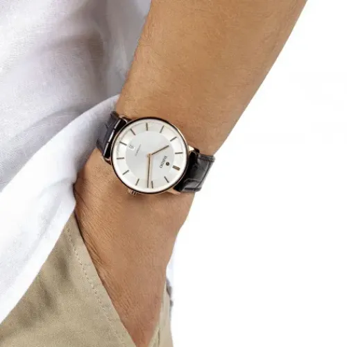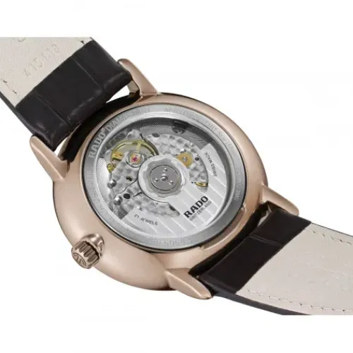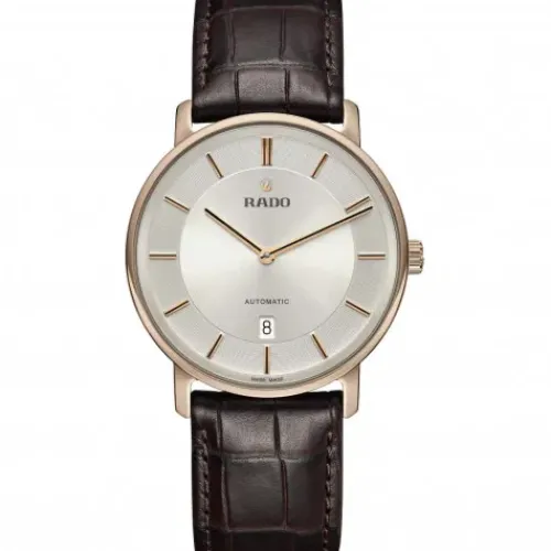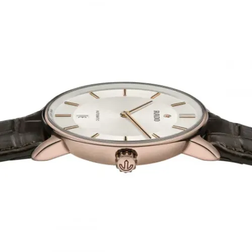 Wir stellen vor: die Rado DiaMaster Thinline Automatic Bei diesem von einem Rado Automatikwerk R766 angetriebenen Modell werden Tradition und Innovation nahtlos miteinander vereint. Dank einer beeindruckenden Gangreserve von 72 Stunden verfügt diese Uhr zudem über eine garantiert lange Laufzeit. …Das 41 mm grosse Gehäuse der DiaMaster Thinline Automatic aus poliertem, roségoldfarbenem Ceramos™ zeichnet sich durch seine äusserst solide Monobloc-Konstruktion aus. Der aufgepresste Gehäuseboden aus Titan ist mit einem Saphirglas ausgestattet und sorgt damit für einen Hauch von Raffinesse. Das silberne Zifferblatt – akzentuiert mit roségoldfarbenen applizierten Indizes mit schwarzer Einlage – bezaubert mit seinem Wechselspiel aus Licht und Schatten. Für eine ausgezeichnete Lesbarkeit sorgen die roségoldfarbenen Zeiger, ebenfalls mit schwarzer Einlage. Gleichzeitig verleihen die Zeiger dem Modell einen Hauch von Luxus. Abgerundet wird das Ensemble durch ein braunes Lederarmband mit einer Schliessenabdeckung aus roségoldfarbenem Ceramos™, das sowohl Raffinesse als auch Komfort ausstrahlt.