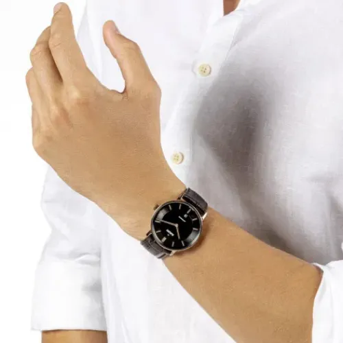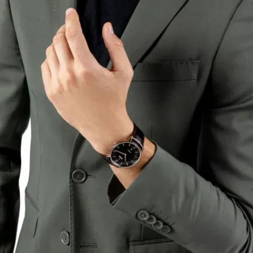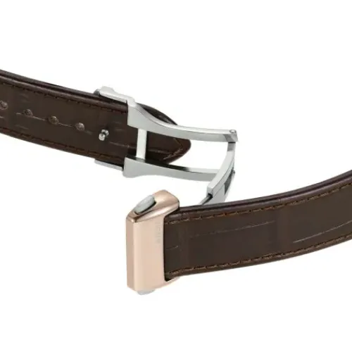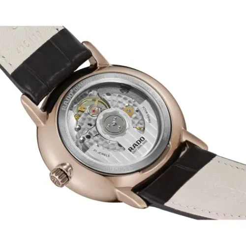Wir stellen vor: die Rado DiaMaster Thinline Automatic Bei diesem von einem Rado Automatikwerk R766 angetriebenen Modell werden Tradition und Innovation nahtlos miteinander vereint. Dank einer beeindruckenden Gangreserve von 72 Stunden verfügt diese Uhr zudem über eine garantiert lange Laufzeit. …Das 41 mm grosse Gehäuse der DiaMaster Thinline Automatic aus poliertem, roségoldfarbenem Ceramos™ zeichnet sich durch seine äusserst solide Monobloc-Konstruktion aus. Der aufgepresste Gehäuseboden aus Titan ist mit einem Saphirglas ausgestattet und sorgt damit für einen Hauch von Raffinesse. Das schwarze Zifferblatt – akzentuiert mit roségoldfarbenen applizierten Indizes mit schwarzer Einlage – bezaubert mit seinem Wechselspiel aus Licht und Schatten. Für eine ausgezeichnete Lesbarkeit sorgen die roségoldfarbenen Zeiger, ebenfalls mit schwarzer Einlage. Gleichzeitig verleihen die Zeiger dem Modell einen Hauch von Luxus. Abgerundet wird das Ensemble durch ein braunes Lederarmband mit einer Schliessenabdeckung aus roségoldfarbenem Ceramos™, das sowohl Raffinesse als auch Komfort ausstrahlt.