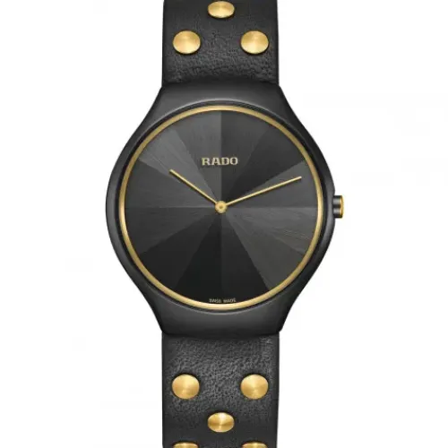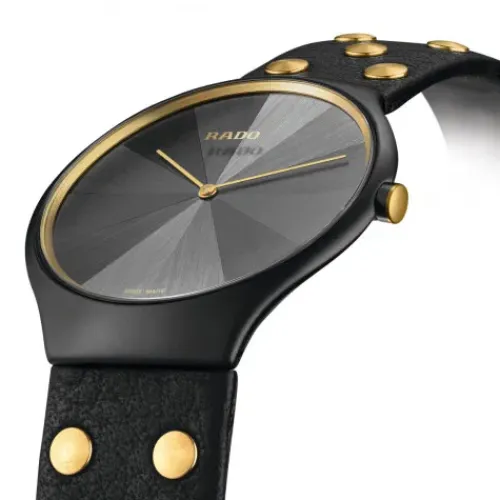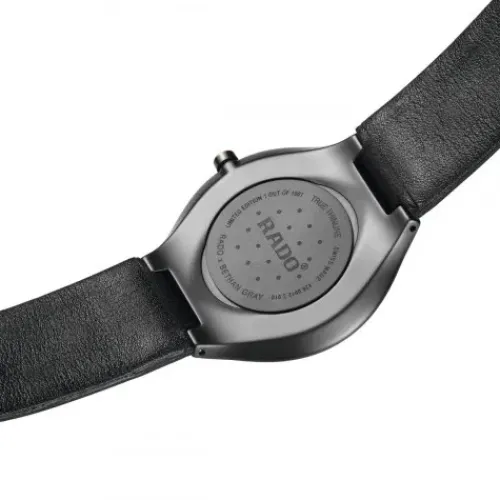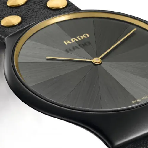 Rado hat mit der preisgekrönten britischen Designerin Bethan Gray an der modernen True Thinline Kollektion gearbeitet und die flachste Uhr der Marke um luxuriöse Materialien und faszinierende Elemente bereichert. Inspiriert durch ihre Möbel- und Textildesigns verfügt die True Thinline Studs in …limitierter Auflage über ein Zifferblatt mit einem grau schillernden Marketerie-Muster und ein Monobloc-Gehäuse aus mattschwarzer Hightech-Keramik mit goldfarbenen Elementen auf dem Zifferblattring und der Krone.