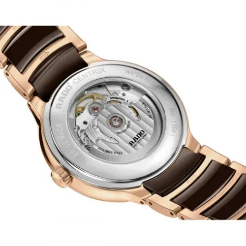 Die klassische Centrix Automatic Diamonds wurde nicht nur technisch, sondern auch ästhetisch überarbeitet. Beim neuen Modell reicht das abgerundete Saphirglas bis hin zum Rand. Außerdem geht das gewölbte Gehäuse nahtlos in den geschwungenen Kristallrand über. Die Gesamtoptik dieses …ikonischen Zeitmessers wird durch überarbeitete Bandanstöße am Gehäuse und ein Armband aus poliertem roségoldfarbenen Edelstahl mit PVD-Beschichtung und Mittelgliedern aus brauner Hightech-Keramik abgerundet. Das braune Zifferblatt mit Sonnenschliff und 12 Diamanten wird durch das per Druck aufgetragene Jubilé-Logo noch besser zur Geltung gebracht und ist perfekt auf die roségoldfarbenen Zeiger abgestimmt. Im Inneren übertrifft das mit drei Zeigern ausgestattete, in 5 statt 3 Lagen getestete Uhrwerk vom Kaliber R763 dank einer nicht-magnetischen Nivachron™ Spiralfeder die Standardtestanforderungen und sorgt für eine höhere Zuverlässigkeit und Genauigkeit. Die Uhr ist bis zu einer Tiefe von 50 m wasserdicht und bietet eine Gangreserve von 80 Stunden.