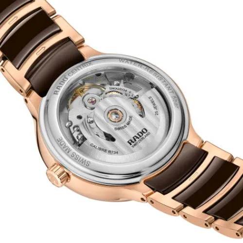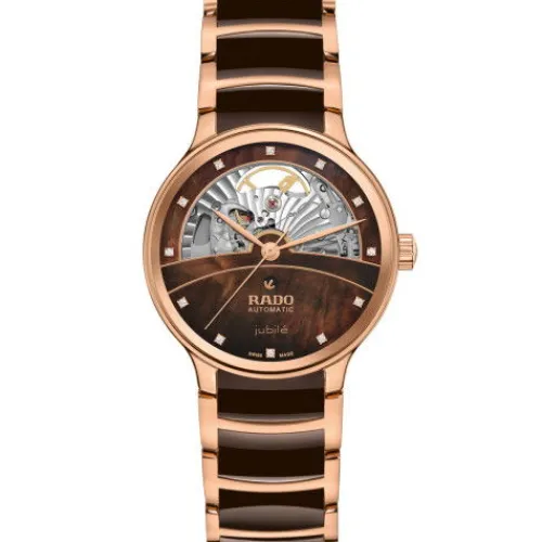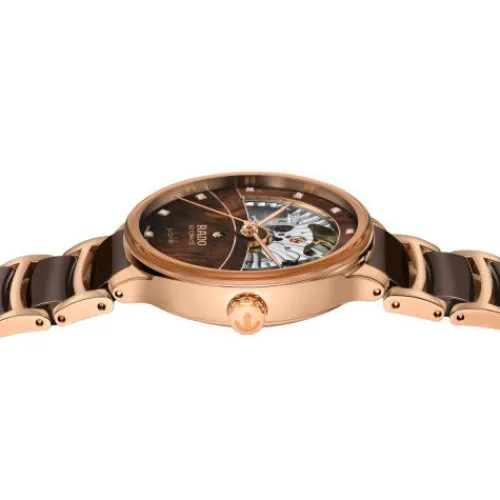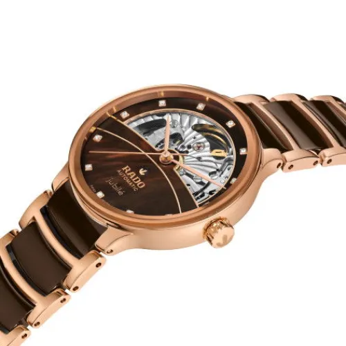 Erleben Sie mit der Rado Centrix Open Heart die harmonische Verbindung von künstlerischem Ausdruck und Design. Während die Konstellationen am Sternenhimmel ewige Geschichten schreiben, bilden die Sterne Brücken, auf denen sich Liebende treffen können. Ein grosses Fenster, das an das Firmament …erinnert, auf dem sich Morgen- und Abenddämmerung abspielen, umrahmt auf wunderschöne Weise das hochmoderne Automatikwerk R734 mit einer Gangreserve von 80 Stunden und einer antimagnetischen NivachronTM Spiralfeder. Es gewährt den Blick auf das elegante „Ondulé Soleil“-Motiv, das auf der Oberfläche ausgewählter Komponenten zu sehen ist und an sich windendes Sonnenlicht erinnert. Die Optik dieses ikonischen Zeitmessers wird durch überarbeitete Bandanstösse am Gehäuse und ein Armband aus poliertem roségoldfarbenen Edelstahl mit PVD-Beschichtung und Mittelgliedern aus brauner Hightech-Keramik abgerundet. Das Zifferblatt aus dunkelbraunem Perlmutt mit 12 Diamanten wird durch das aufgedruckte roségoldfarbene Jubilé-Logo, das perfekt mit den Zeigern harmoniert, noch betont. Die Uhr ist bis zu einer Tiefe von 50 m wasserdicht und auch in Grösse L erhältlich.