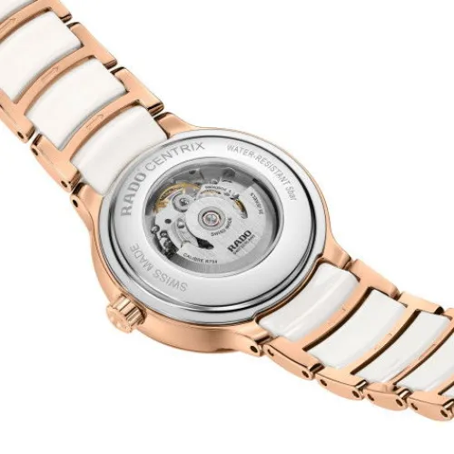 Erleben Sie mit der Rado Centrix Open Heart die harmonische Verbindung von künstlerischem Ausdruck und Design. Während die Konstellationen am Sternenhimmel ewige Geschichten schreiben, bilden die Sterne Brücken, auf denen sich Liebende treffen können. Ein grosses Fenster, das an das Firmament …erinnert, auf dem sich Morgen- und Abenddämmerung abspielen, umrahmt auf wunderschöne Weise das hochmoderne Automatikwerk R734 mit einer Gangreserve von 80 Stunden und einer antimagnetischen NivachronTM Spiralfeder. Es gewährt den Blick auf das elegante „Ondulé Soleil“-Motiv, das auf der Oberfläche ausgewählter Komponenten zu sehen ist und an sich windendes Sonnenlicht erinnert. Die Optik dieses ikonischen Zeitmessers wird durch überarbeitete Bandanstösse am Gehäuse und ein Armband aus poliertem roségoldfarbenen Edelstahl mit PVD-Beschichtung und Mittelgliedern aus weisser Hightech-Keramik abgerundet. Das Zifferblatt aus weissem Perlmutt mit 12 Diamanten wird durch das aufgedruckte roségoldfarbene Jubilé-Logo, das perfekt mit den Zeigern harmoniert, noch betont. Die Uhr ist bis zu einer Tiefe von 50 m wasserdicht.