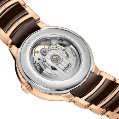 Erleben Sie mit der Rado Centrix Open Heart die harmonische Verbindung von künstlerischem Ausdruck und Design. Während die Konstellationen am Sternenhimmel ewige Geschichten schreiben, bilden die Sterne Brücken, auf denen sich Liebende treffen können. Ein grosses Fenster, das an das Firmament …erinnert, auf dem sich Morgen- und Abenddämmerung abspielen, umrahmt auf wunderschöne Weise das hochmoderne Automatikwerk vom Kaliber R734 mit einer Gangreserve von 80 Stunden und einer antimagnetischen NivachronTM Spiralfeder. Es gewährt den Blick auf das elegante „Ondulé Soleil“-Motiv, das auf der Oberfläche ausgewählter Komponenten zu sehen ist und an sich windendes Sonnenlicht erinnert. Die Optik dieses ikonischen Zeitmessers wird durch überarbeitete Bandanstösse am Gehäuse und ein Armband aus poliertem roségoldfarbenen Edelstahl mit PVD-Beschichtung und Mittelgliedern aus brauner Hightech-Keramik abgerundet. Das Zifferblatt aus dunkelbraunem Perlmutt mit 12 Diamanten wird durch das aufgedruckte roségoldfarbene Jubilé-Logo, das perfekt mit den Zeigern harmoniert, noch betont. Die Uhr ist bis zu einer Tiefe von 50 m wasserdicht und auch in Grösse M erhältlich.