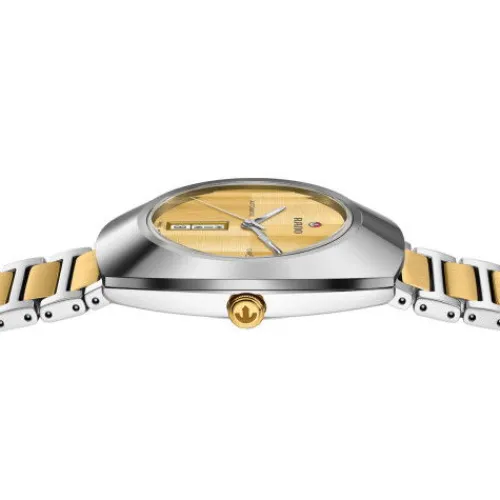 Die einzigartige DiaStar Original hat einen Durchmesser von 38 mm und ist bis zu einer Tiefe von 100 m wasserdicht. Eingerahmt von einer breiten Lünette aus hochglänzendem Ceramos™ mit geschliffenen Schrägen und Details über einem dazu passenden monochromen Gehäuse aus Edelstahl wird diese …schöne Uhr mit einem facettierten Saphirglas mit parallelem Streifenmuster perfekt abgerundet. Zu den Merkmalen der Uhr gehören zudem ein goldfarbenes, in zwei Richtungen gebürstetes Zifferblatt, rhodiumfarbene Zeiger mit weissem Super-LumiNova® und eine Wochentags- und Datumsanzeige, ebenfalls in Weiss. Das Rado R764 Automatikwerk mit antimagnetischer Nivachron™ Spiralfeder bietet eine Gangreserve von 80 Stunden. Das Armband ist aus poliertem und satiniertem Edelstahl gefertigt, während seine Mittelglieder mit einer gelbgoldfarbenen PVD-Beschichtung versehen sind.